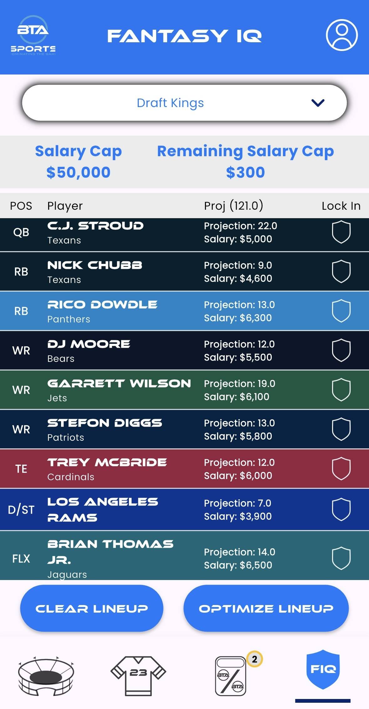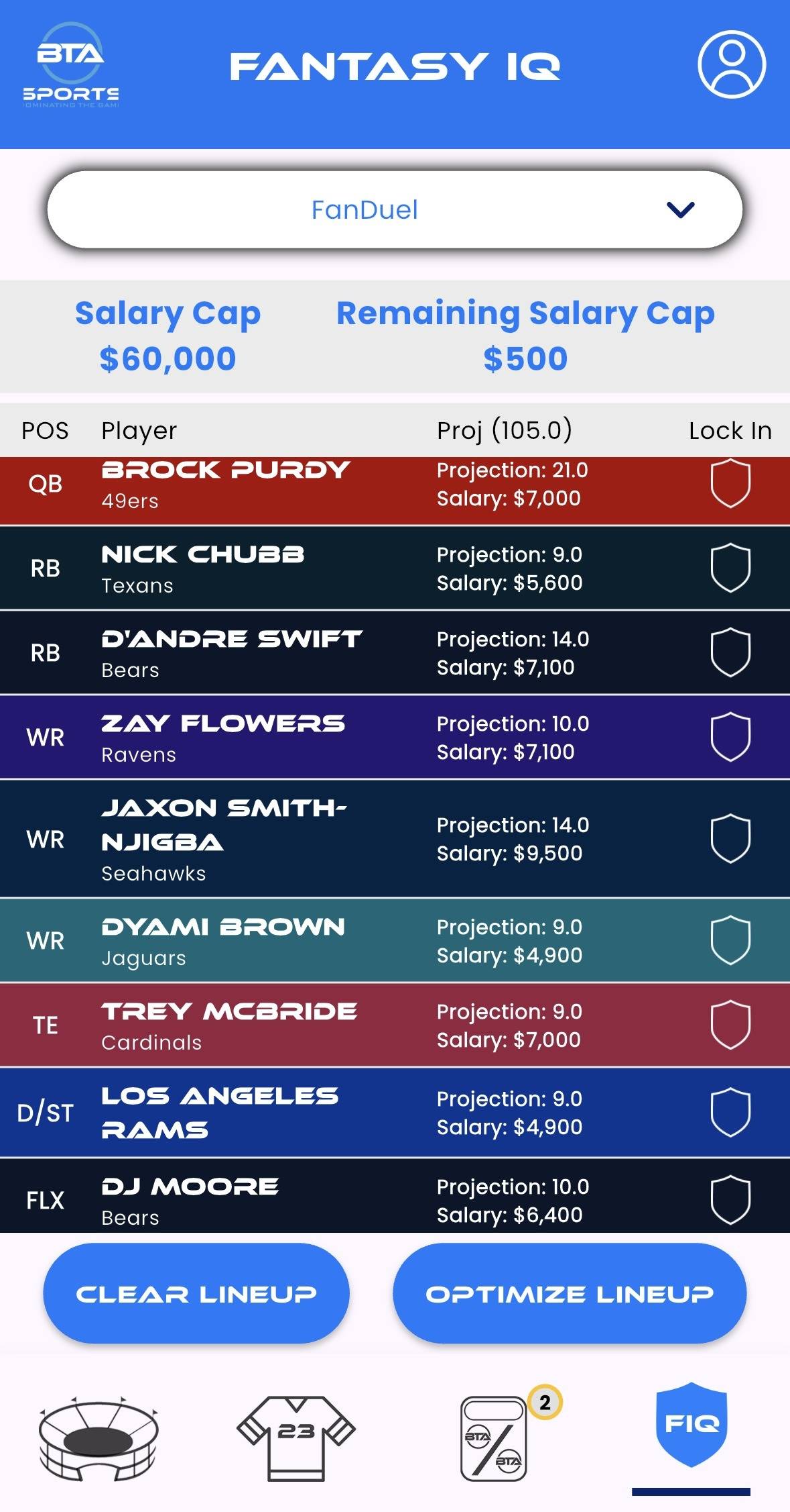 Fantasy IQ is a must-have tool for any daily fantasy player. It delivers AI-driven projections, lineup optimization tips, and side-by-side player comparisons that help you uncover value plays and hidden gems. Add the players that you already wish to add to your lineup, then click the “Optimize Lineup” button and let our AI do the rest. Whether you’re managing a season-long roster or building a daily fantasy lineup, Fantasy IQ gives you the insight you need to make smarter, data-backed decisions.