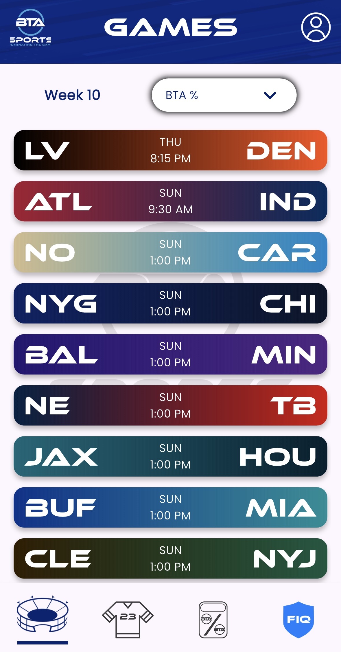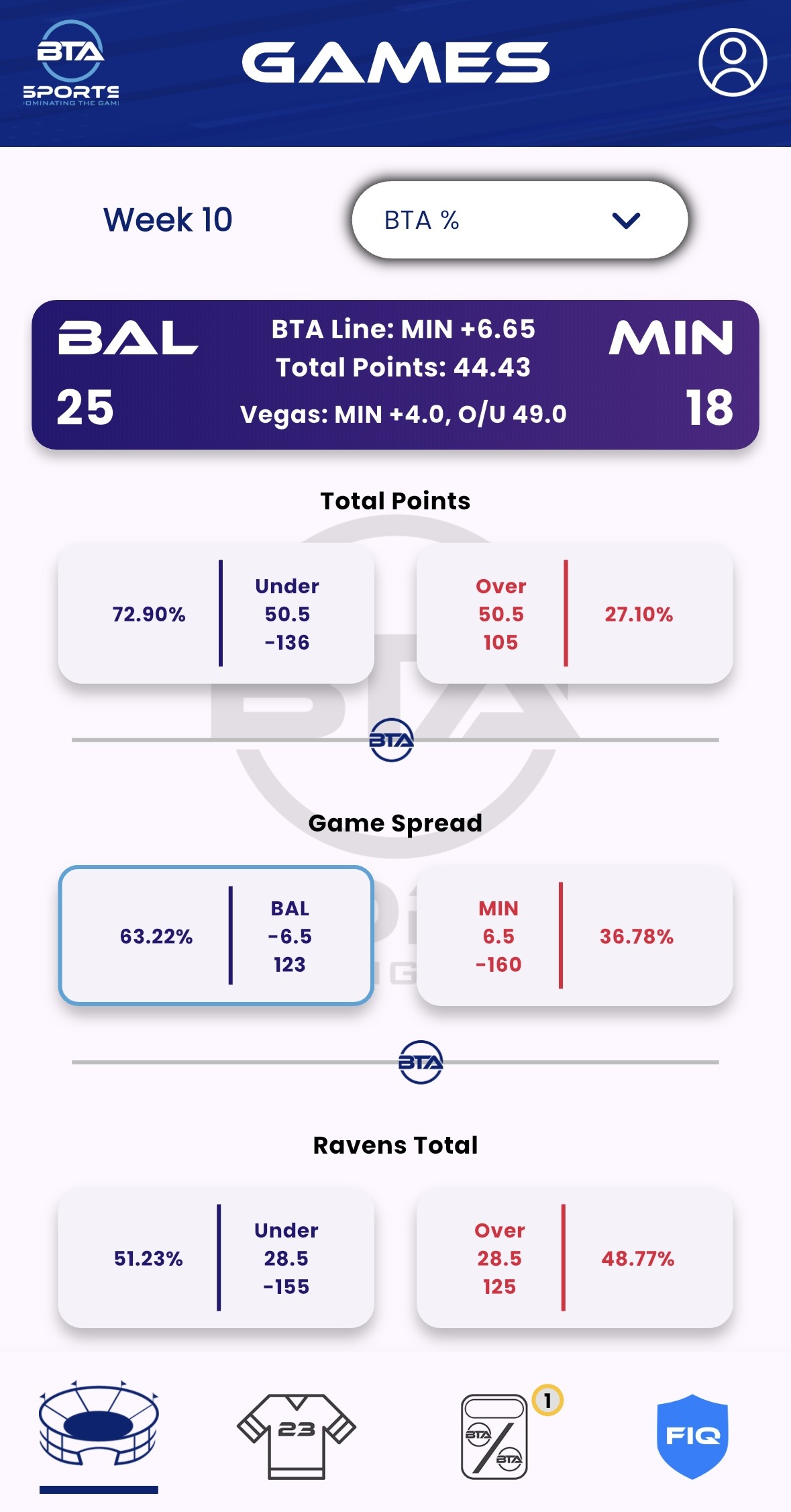 Once you open the app, you’ll land on the Games Tab, which is basically your command center. Every NFL game on the schedule is interactive. Just tap on a matchup to reveal the spread, total, and team point lines. You’ll see BTA’s model predictions and probabilities update live as you explore.